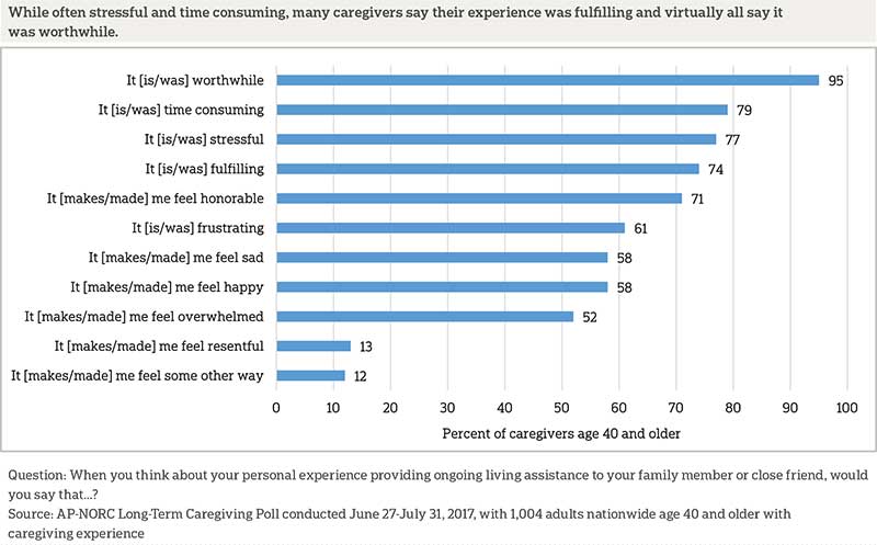 • Virtually all caregivers say the caregiving experience was worthwhile (95 percent) despite more than 3 in 4 characterizing their experiences as stressful or time consuming.