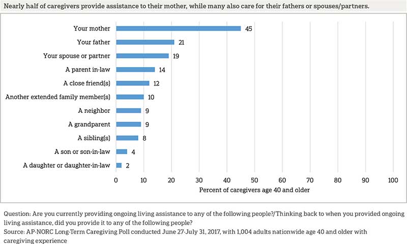 Caregivers provide help to a range of family members and friends, but the majority (63 percent) care for a parent or parent-in-law. They are particularly likely to care for their mother, though many care for their father or parent in-law. Nearly 2 in 10 care for a spouse or partner, while about 1 in 10 care for a close friend, a neighbor, a grandparent, a sibling, or another family member. Fewer (6 percent) provide ongoing living assistance to a child.
