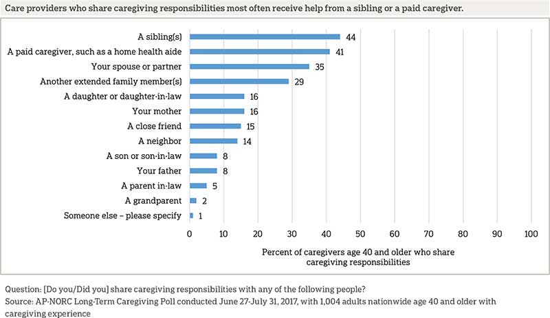 Of those who share caregiving with someone else, providers most frequently divide responsibilities with either a sibling or a paid caregiver. Another 3 in 10 split caregiving tasks with a spouse or partner or with another extended family member. Less than 2 in 10 share responsibilities with their mother, a daughter or daughter-in-law, a close friend, or a neighbor. Even fewer provide care with their father, a son or son-in-law, a parent-in-law, a grandparent, or with someone else.